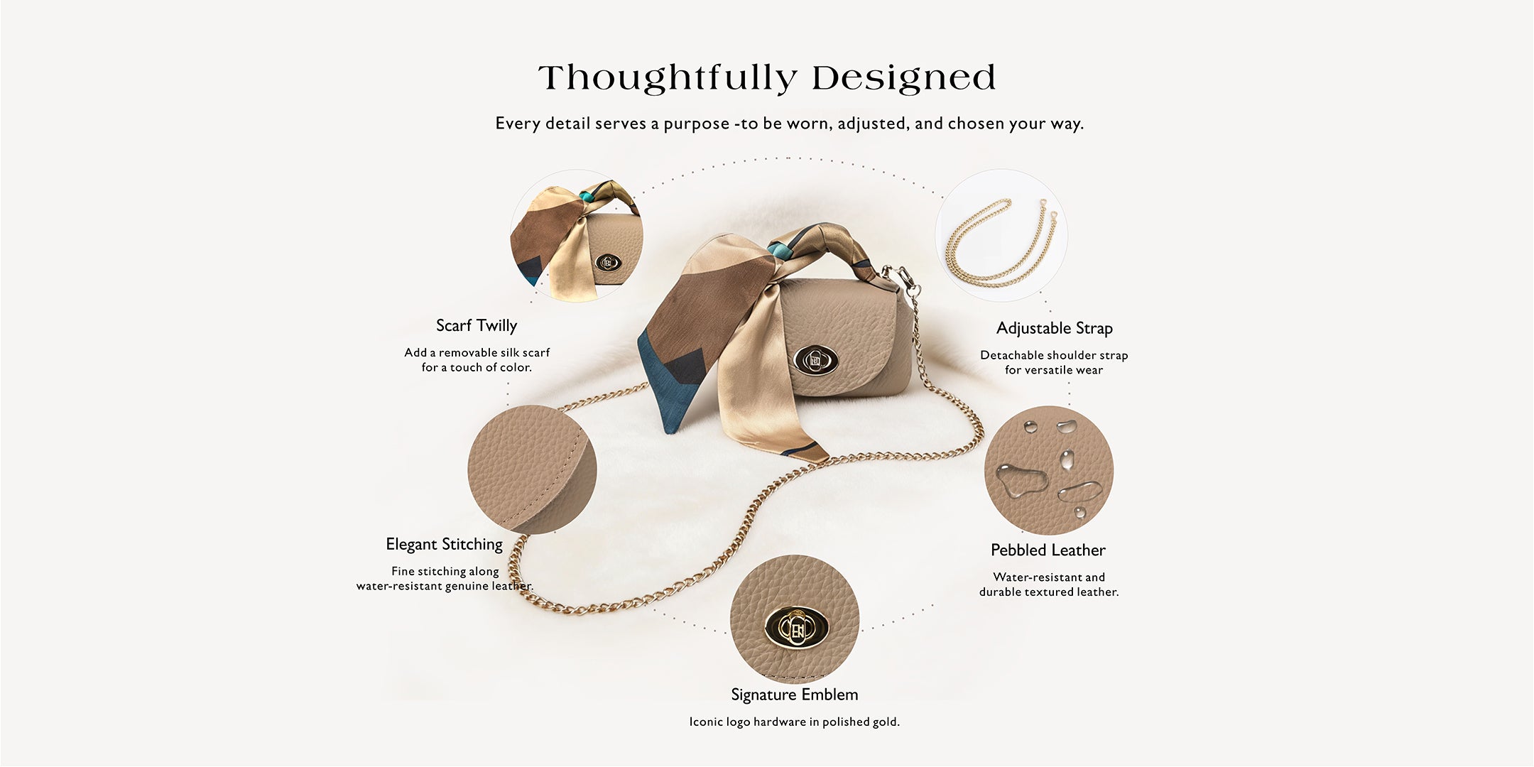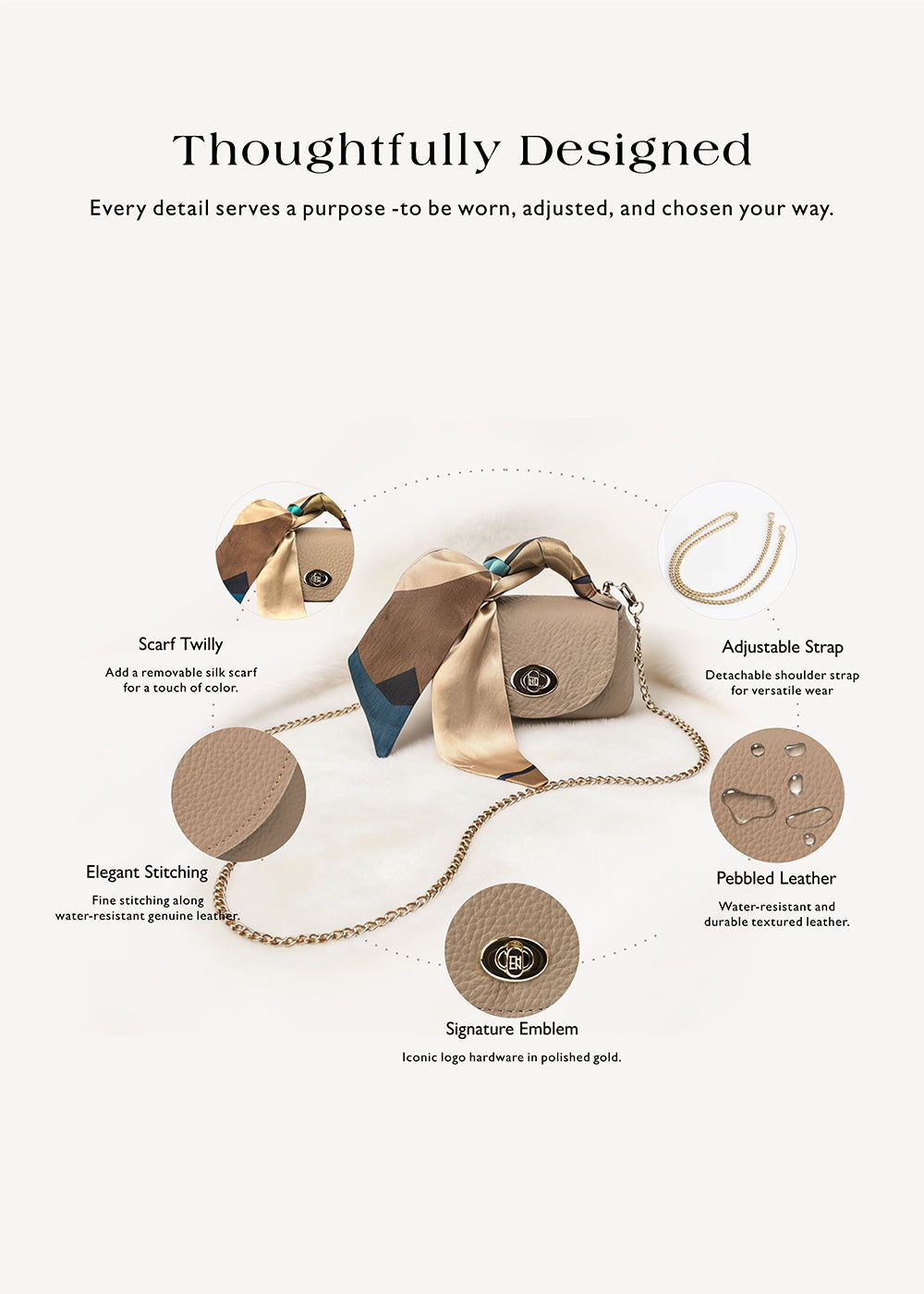 The Stone Grey leather mini crossbody bag features a clean, balanced proportion made for styling. Compact in size, it holds small essentials and is finished with a soft scarf and a gold-tone chain for effortless transitions.