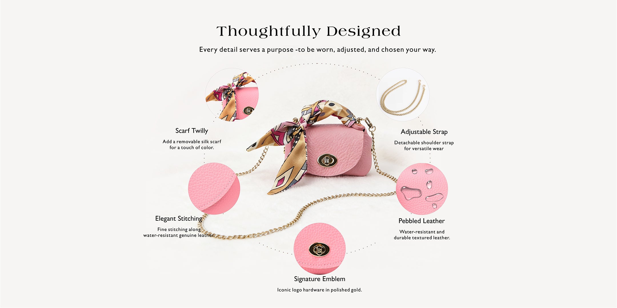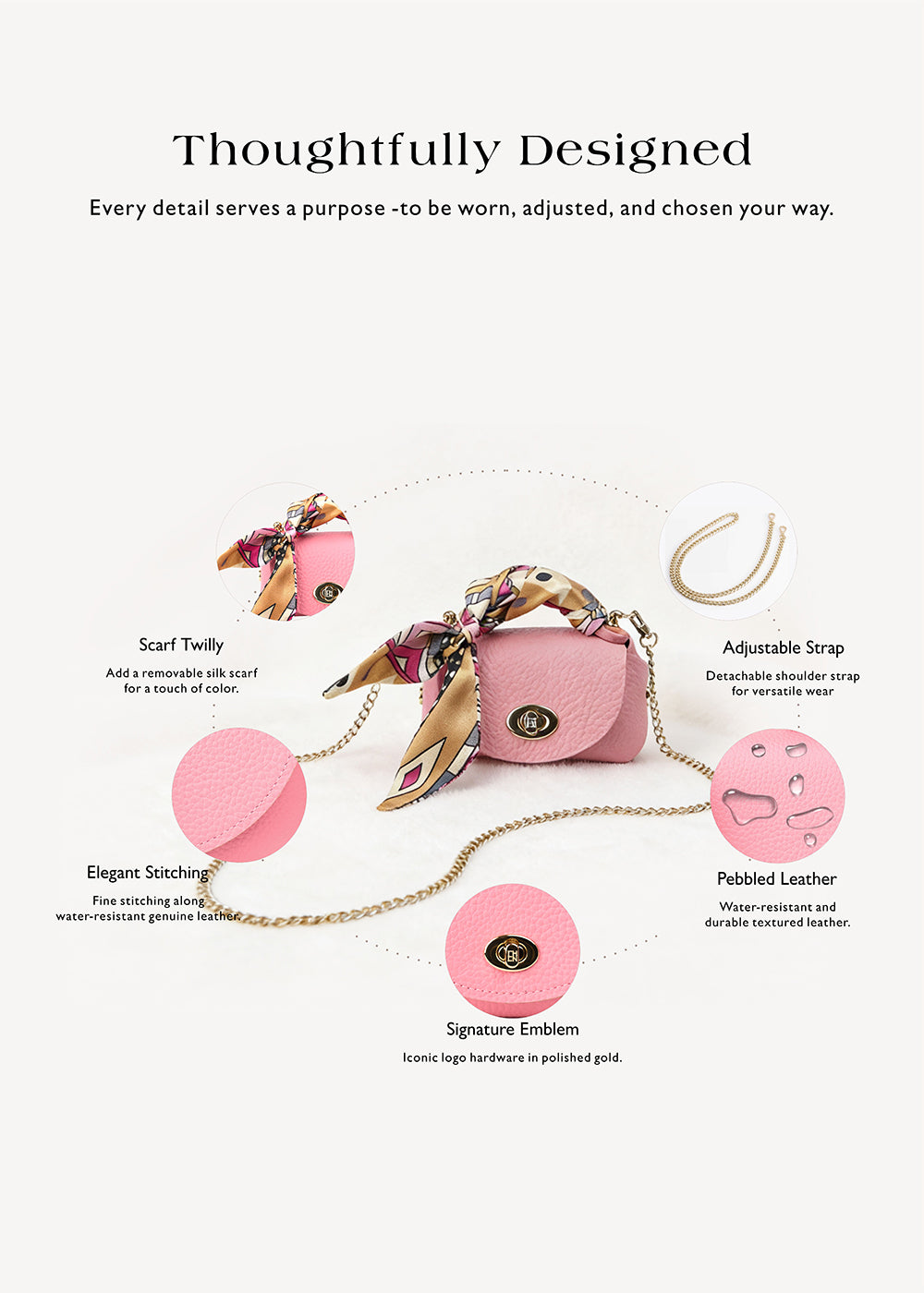 The Blush Rose Pink leather mini crossbody bag features a clean, balanced proportion designed for styling. Compact in size, it holds small essentials and is finished with a soft scarf and a gold-tone chain.