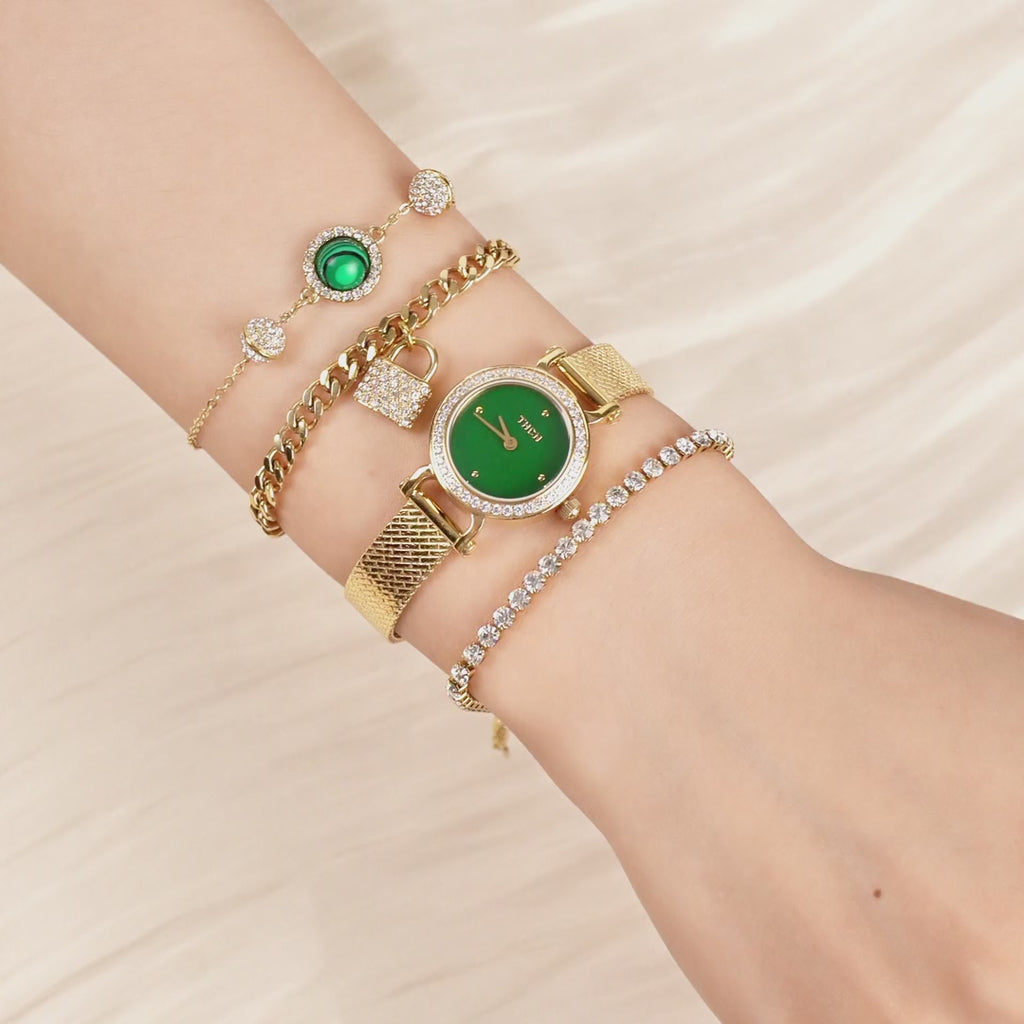 THCN Ladies Gold Watch & Malachite Bracelets Gift Set (One Watch & Three Free Bracelets)