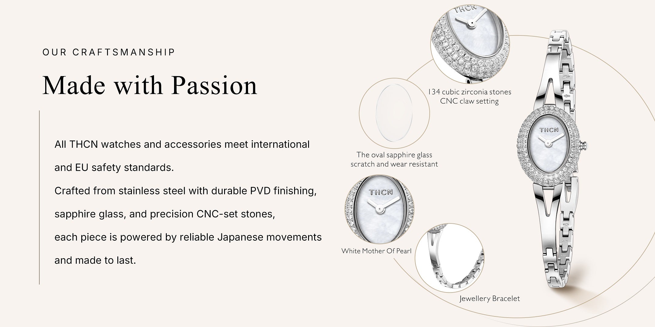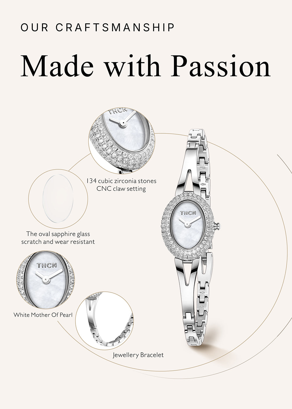 An 8.5mm slim jewelry clasp bracelet transforms the watch into a wearable piece of jewelry. Worn alone, it is effortlessly eye-catching; paired with THCN’s classic bracelet designs, it becomes a natural focal point for any occasion.