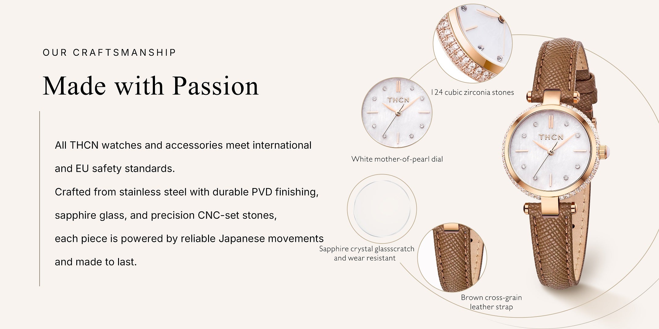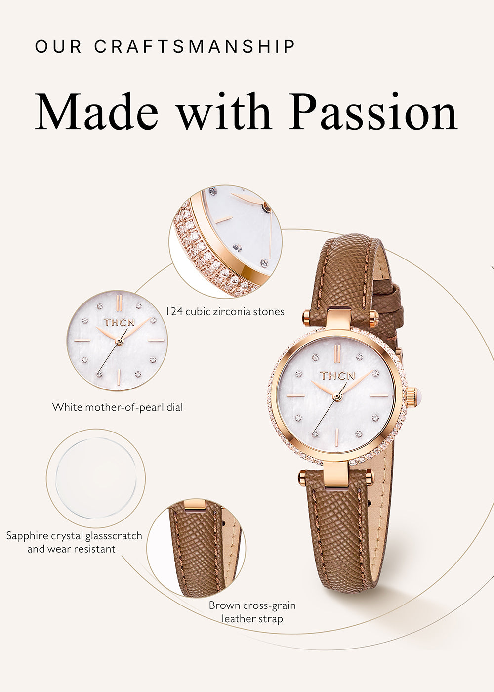 Sapphire crystal glass paired with a natural mother-of-pearl dial presents understated luxury within a minimalist design, making it effortless for everyday wear and ideal for layering with jewelry.